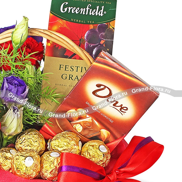 ЛЮКС: шоколад "DOVE" - 1 шт., чай "Greenfield" - 1 шт., конфеты "Ferrero Rocher" - 1 шт., эустома - 4 шт., гвоздика - 5 шт., декоративная зелень, оазис, корзина малая, красно-фиолетовый бант, фетр.