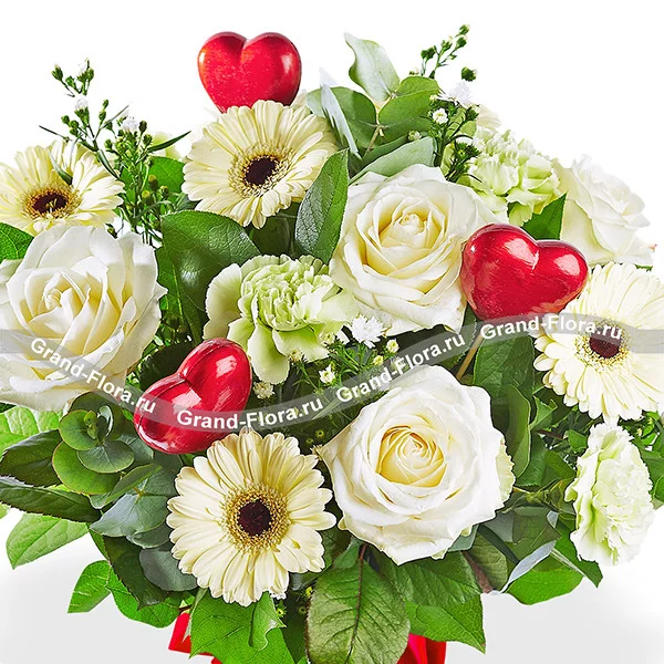 Уменьшенный: роза белая - 3 шт., гербера кремовая - 2 шт., гвоздика зеленая - 2 шт., рускус - 2 шт., гипсофила - 1 шт., эвкалипт - 1 шт., сердце красное (декоративное) - 1 шт., упаковка, бант красный. Примерный размер: 20Х20 см.