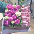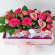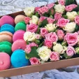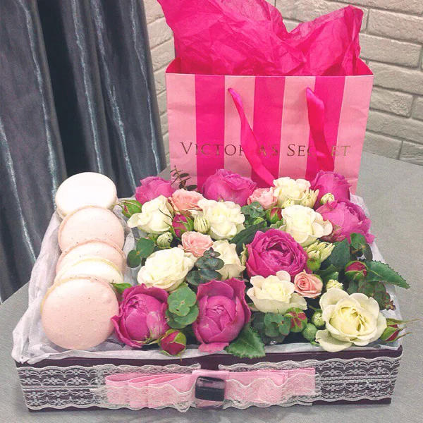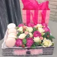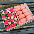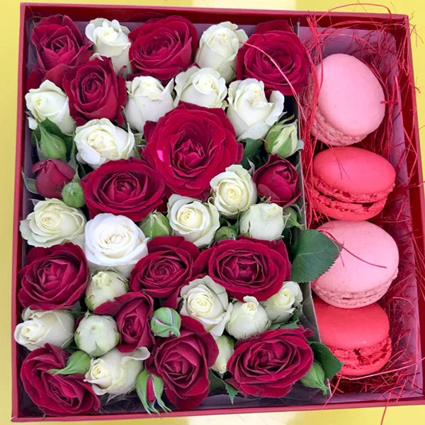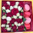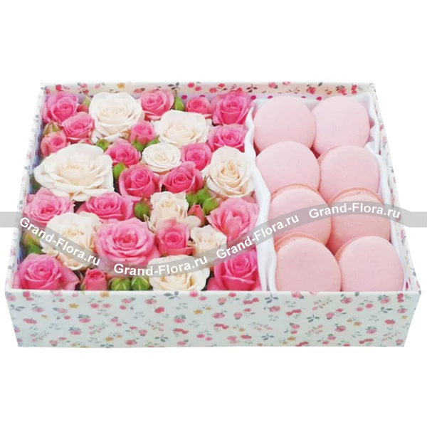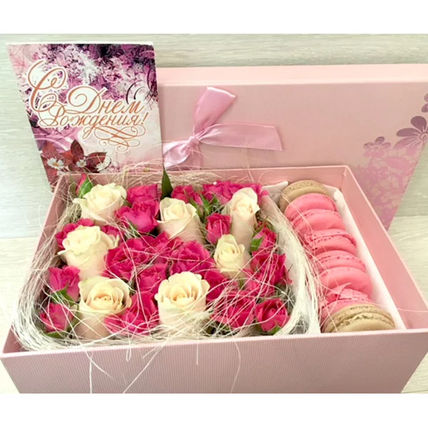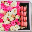 Уменьшенный: роза кустовая розовая - 2 шт., роза кустовая белая - 1 шт., макаруны - 4шт., декор, оазис, коробка малая.
