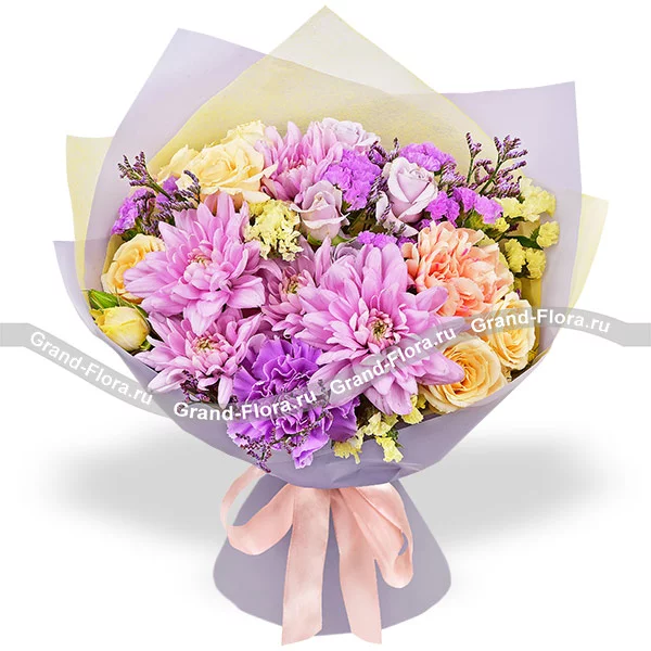 Стандартный: гвоздика фиолетовая - 2 шт., гвоздика персиковая - 1 шт., хризантема кустовая ромашковая фиолетовая - 2 шт., кустовая роза желтая - 2 шт., кустовая роза фиолетовая - 2 шт., статица, лимониум, упаковка, лента. Примерный размер: 30Х30 см.