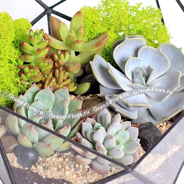Флорариум "Краски лета" - это прекрасное сочетание несколько видов ярких суккулентов в геометрической вазе ручной работы. Такая композиция не оставит равнодушными ваших родных и близких, а цветение суккулентов весной вызовет восторг и восхищение.