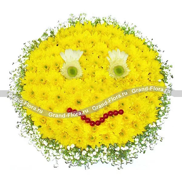 Стандартный: хризантема кустовая ромашковая (желтая) - 25 шт., гербера белая - 2 шт., бусинки (или гиперикум красный), гипсофила - 7 шт., оазис круглый.